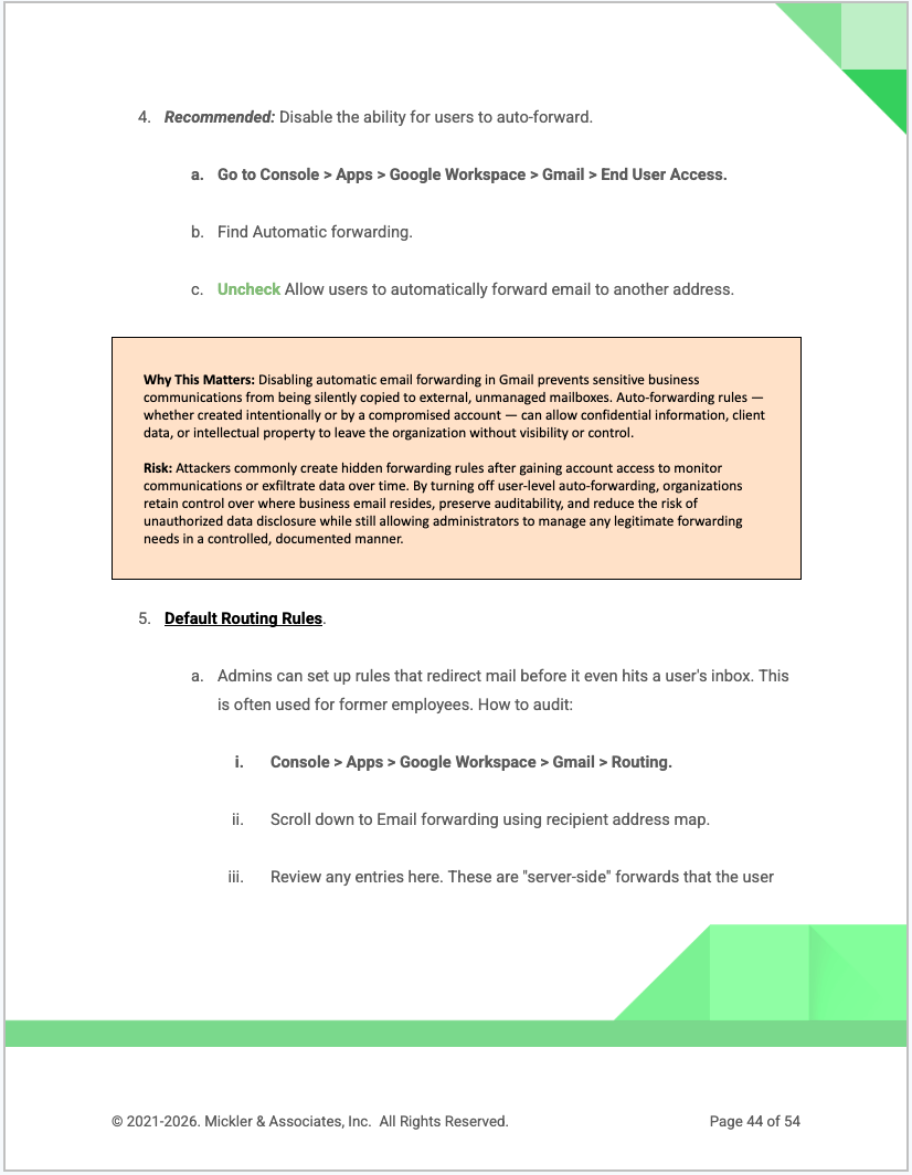 Gmail Security & Anti-Abuse Controls. Assessment of phishing and malware protections, spoofing defenses, forwarding risks, legacy protocol use, and routing rules.